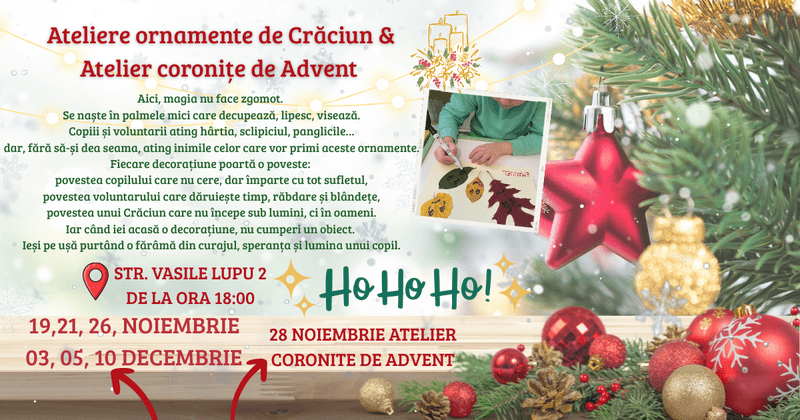 În datele de 19, 21, 26, 28 noiembrie și 03, 05, 10 decembrie, vom organiza ateliere de creație la care sunt invitați să participe toți cei care doresc să dăruiască din timpul și inima lor.