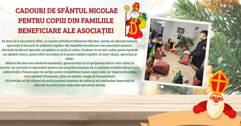 Pe data de 6 decembrie 2025, cu ocazia sărbătorii Sfântului Nicolae, dorim să aducem lumină, speranță și bucurie în sufletele copiilor din familiile beneficiare ale asociației noastre, oferindu-le daruri speciale, pregătite cu grijă și iubire. Credem că un mic cadou poate aprinde un zâmbet sincer, poate oferi încredere și le poate aminti copiilor că sunt văzuți, apreciați și iubiți.