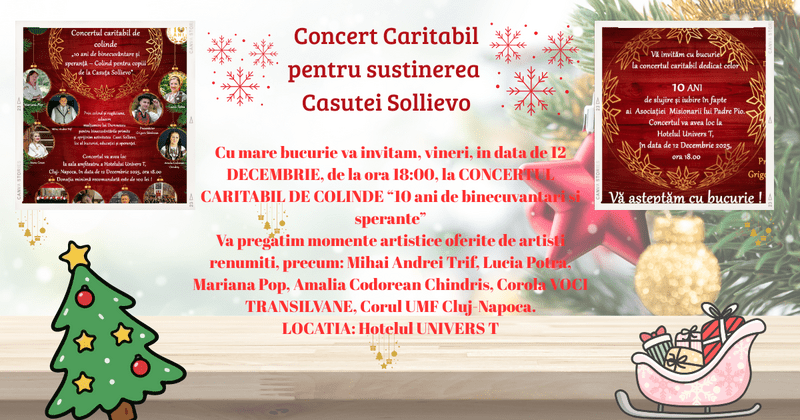 Într-o sală de excepție, pusă la dispoziție cu amabilitate de conducerea Hotelului Univers T , vom avea parte de o atmosferă de sărbătoare, stand cu vânzare de obiecte decorative și de sezon, realizate de copiii și voluntarii noștri, mărturii și povești de viață, toate având ca scop susținerea Casei Sollievo, a putea rămâne deschisă și în anul următor !